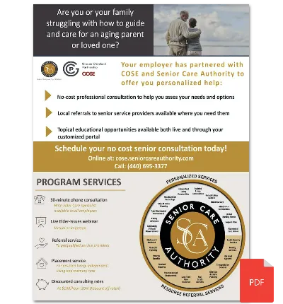 Because your employer is part of COSE, Senior Care Authority consulting services are available to you at a discounted rate. Learn about community resources, set up in home care, have assistance with getting your loved one to medical appointments, evaluate your insurance, long distance caregiving issues, and more…